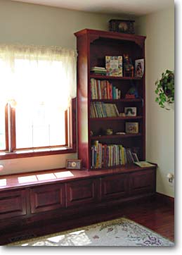 Solid maple with a cherry finish. Built-in window seat with accessible storage and end-cap bookshelves.